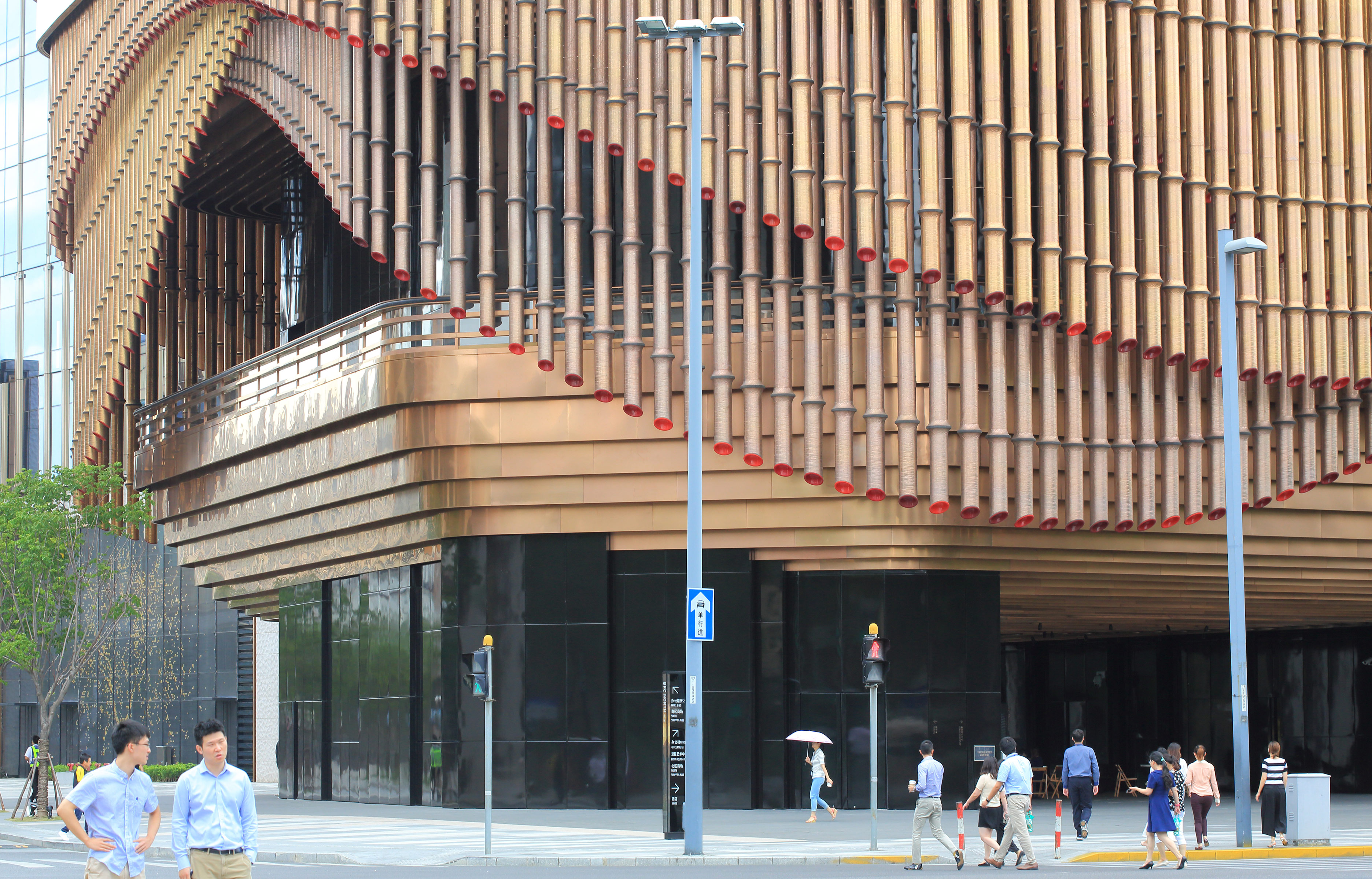 Composée de trois rideaux de tubes cuivrés, elle reprend l’aspect du bambou, très prisé par les Chinois.