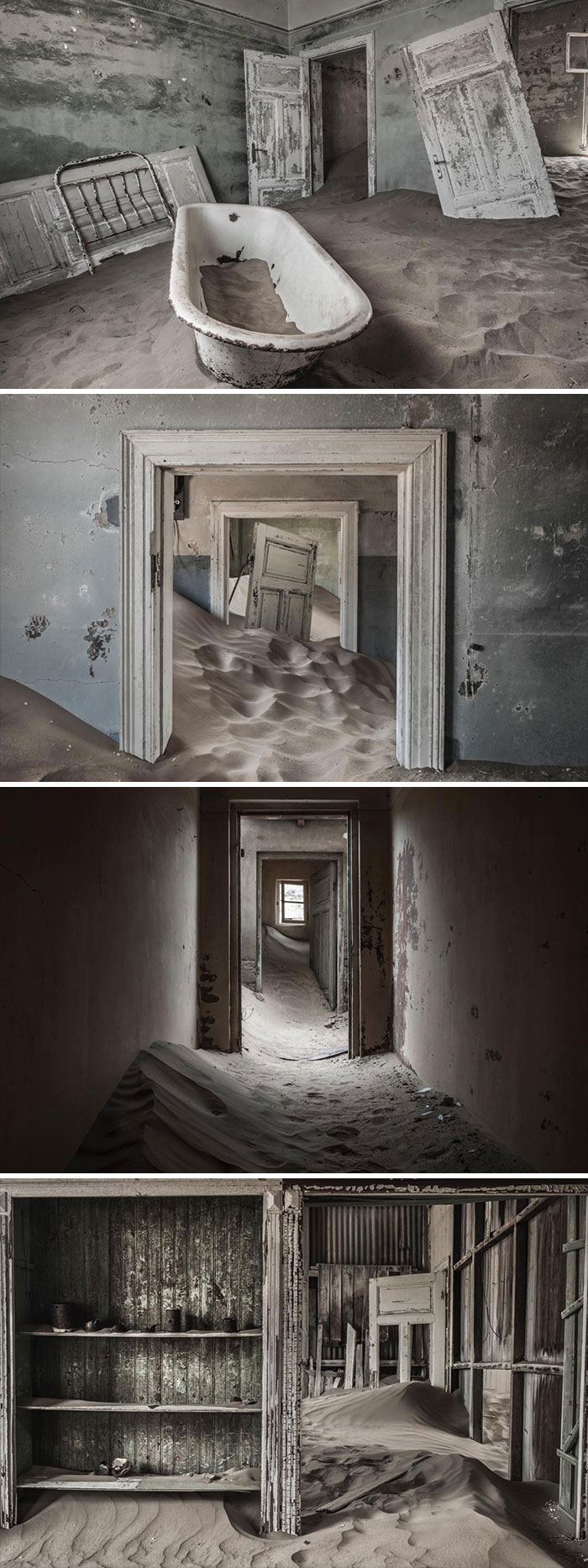 Un escalator recouvert de feuilles, une maison, un château, un vélo, une voiture méconnaissables, et puis des dunes de sable qui envahissent une demeure pour la rendre une dune de plus!