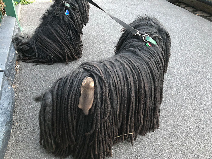Il faut savoir que le chien de race puli Hongrois a un pelage long et torsadé. Comme vous allez le voir en image, il est difficile pour lui de sentir cette présence… Aussi lourde soit-elle.