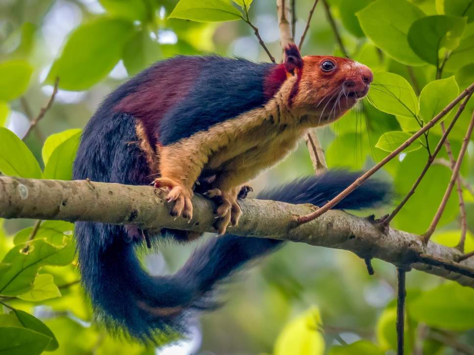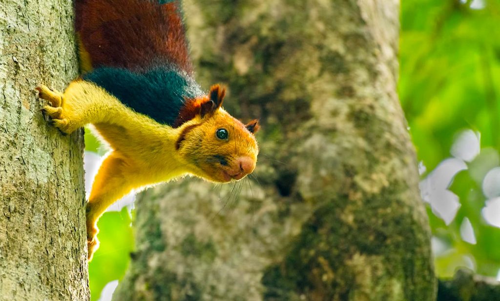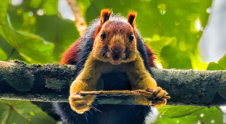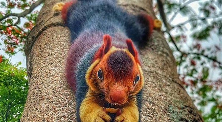 Voici l’écureuil géant de l’Inde. C’est une espèce très surprenante! Très colorée surtout! On l’appelle aussi l’écureuil Malabar du nom scientifique  » Ratufa Indica ».
